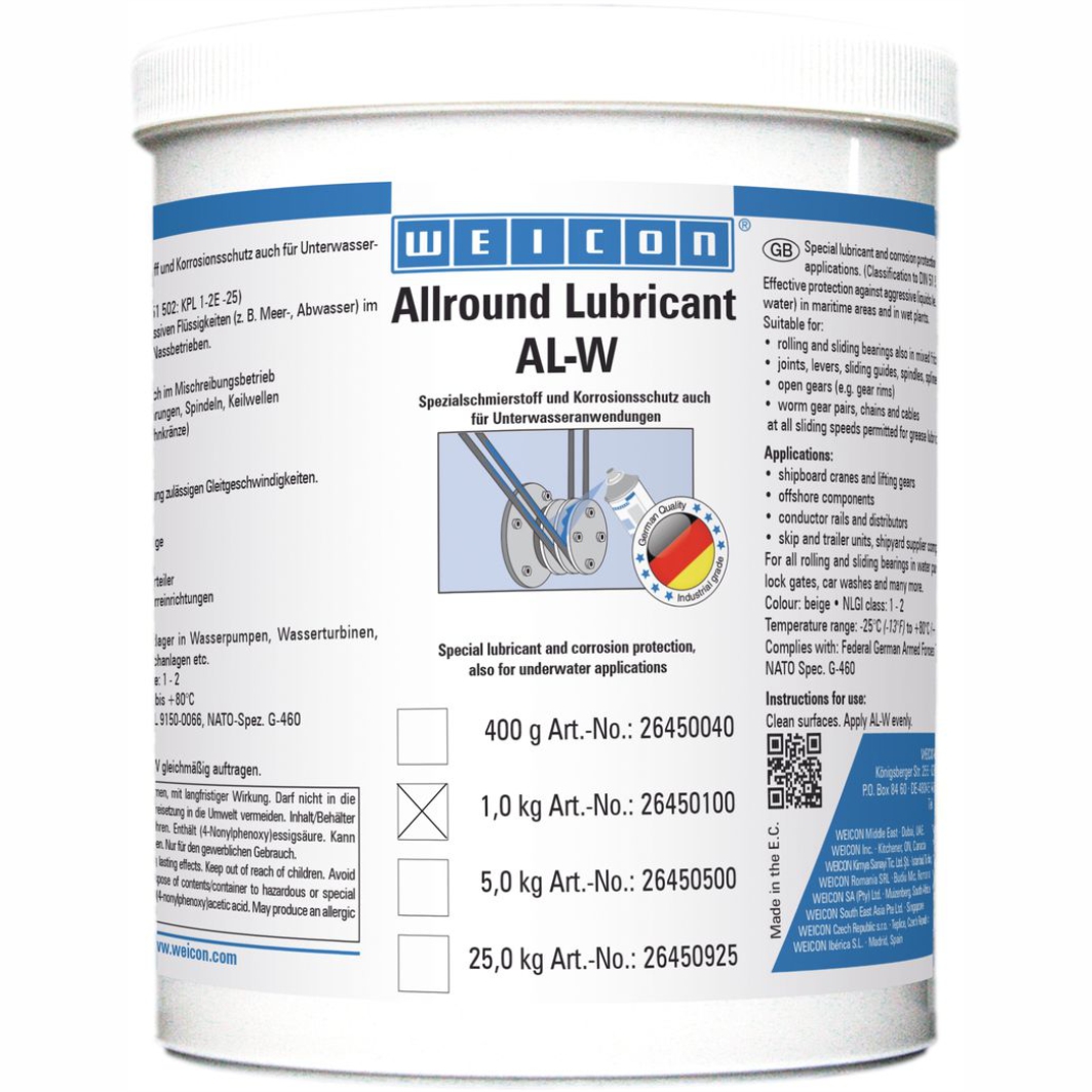 WEICON AL-W bietet wirksamen Schutz vor aggressiven Flüssigkeiten, wie Meer- oder Abwasser, sowohl im maritimen Bereich als auch in Nassbetrieben. Der Schmierstoff eignet sich für Wälz- und Gleitlager auch im Mischreibungsbetrieb, Gelenke, Hebel, Gleitführungen, Spindeln, Keilwellen, offene Getriebe, Schneckengetriebe, Ketten und Drahtseile 13 bei allen für die Fettschmierung zulässigen Gleitgeschwindigkeiten.