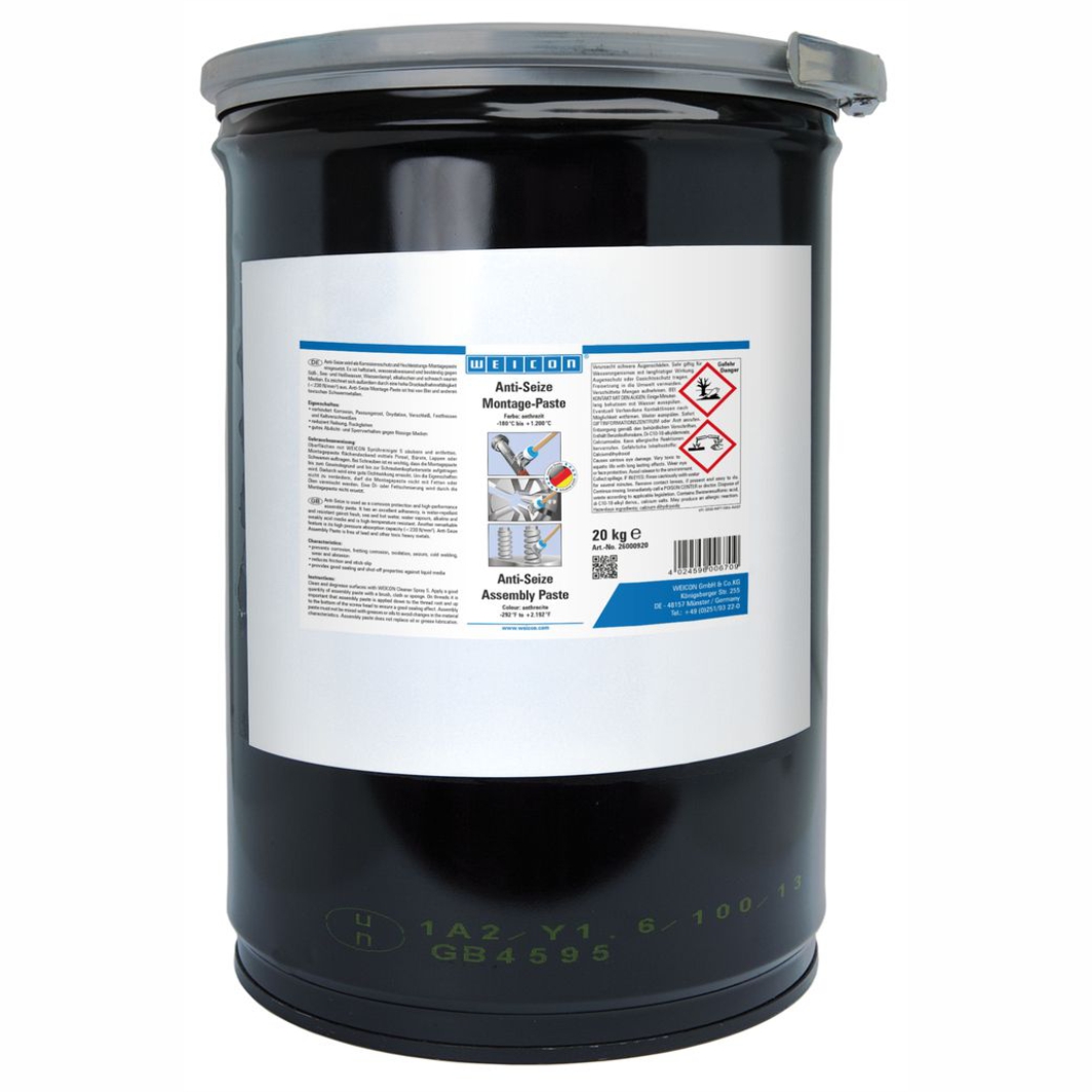 WEICON Anti-Seize ist hochtemperaturbeständig und hat eine außergewöhnlich gute Trennwirkung. Anti-Seize wird als Schutz-, Trenn- und Schmierstoff für hochbeanspruchte Teile eingesetzt. Optimal aufeinander abgestimmte Feststoffanteile sowie ausgewählte Additive ermöglichen ein breites Anwendungsspektrum. Anti-Seize schützt vor Korrosion, Festfressen und Verschleiß, stick-slip-Erscheinungen, Oxidation und Passungsrost und elektrolytischen Reaktionen ( 1EKaltverschweißen 1C).