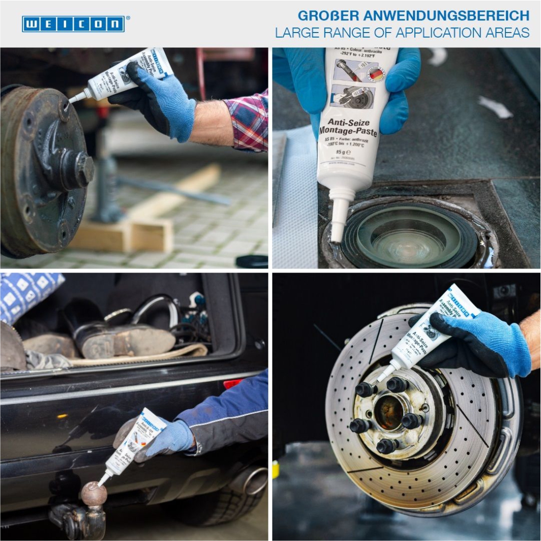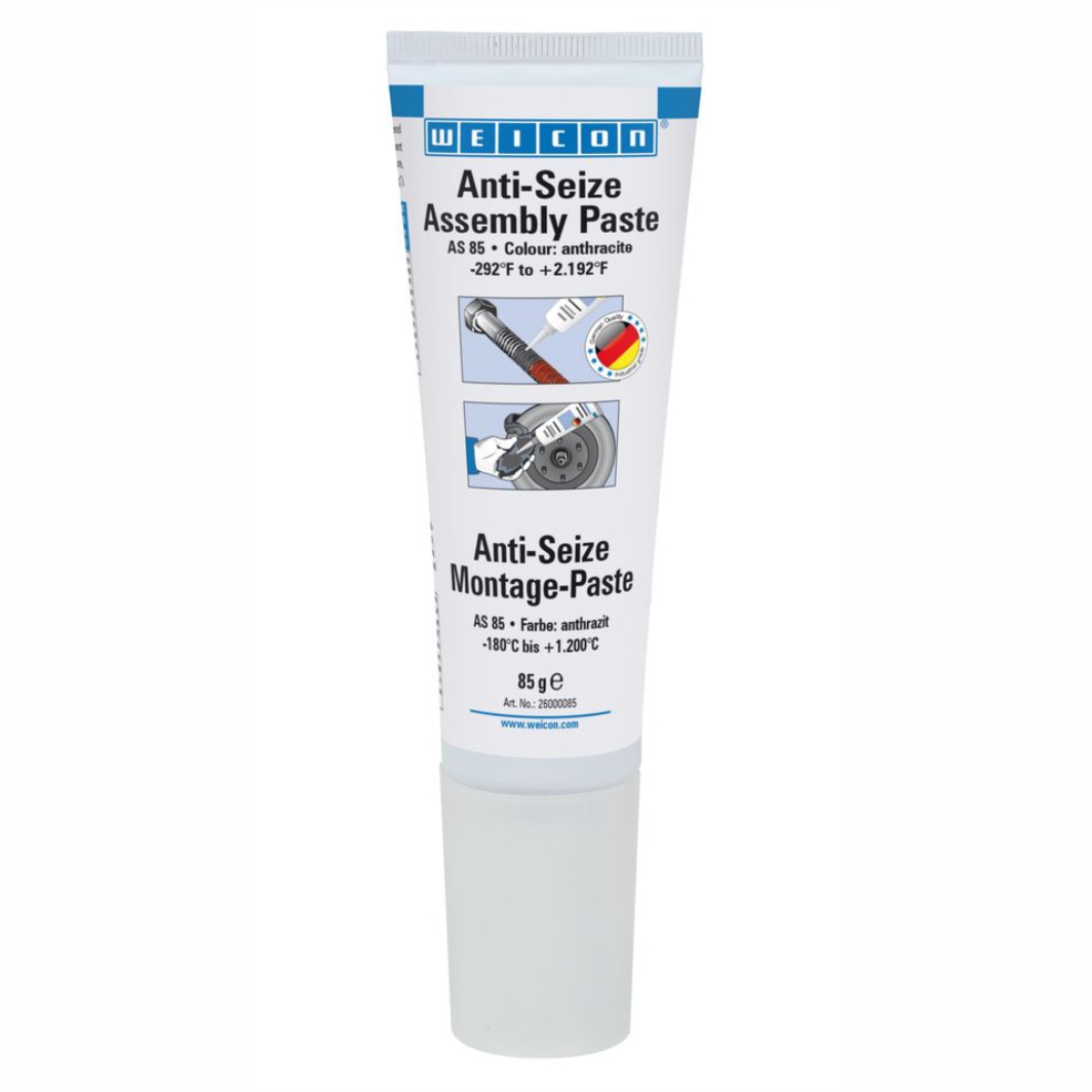 WEICON Anti-Seize ist hochtemperaturbeständig und hat eine außergewöhnlich gute Trennwirkung. Anti-Seize wird als Schutz-, Trenn- und Schmierstoff für hochbeanspruchte Teile eingesetzt. Optimal aufeinander abgestimmte Feststoffanteile sowie ausgewählte Additive ermöglichen ein breites Anwendungsspektrum. Anti-Seize schützt vor Korrosion, Festfressen und Verschleiß, stick-slip-Erscheinungen, Oxidation und Passungsrost und elektrolytischen Reaktionen ( 1EKaltverschweißen 1C).