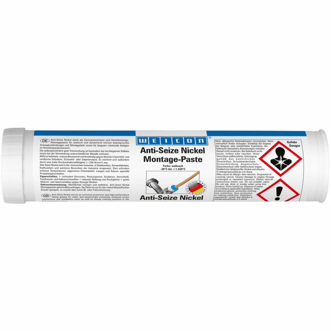 Die Montagepaste wurde entwickelt, um extremen Bedingungen standhalten zu können. Sie ist haftstark, wasserabweisend und beständig gegen Süßwasser, Seewasser, Heißwasser sowie Wasserdampf. Der hohe Nickelanteil der Paste bietet außerdem Schutz gegen fressende und ätzende Lösungsmittel, die unter anderem in verdünnter Salzsäure, Schwefel- oder Salpetersäure enthalten sind. WEICON Anti-Seize Nickel ist in einem extrem großen Temperaturbereich zwischen -30 °C bis +1.450 °C einsetzbar. Anti-Seize Nickel dient als Korrosionsschutz und Hochleistungs- Montagepaste für statisch und dynamisch extrem beanspruchte Schraubverbindungen und Montageteile sowie dem Einsatz an langsam rotierenden Anlagen im Hochtemperaturbereich. Die Paste schützt vor Korrosion, Festfressen, Verschleiß, Stick-Slip-Effekte, Oxidation und Passungsrost sowie vor elektrolytischen Reaktionen, dem so genannten Kaltverschweißen. Anti-Seize Nickel kann beispielsweise an Dichtungen, Ventilen, Verschraubungen, Zahnrädern, Lagern, Düsen, Förderbändern, Stehbolzen, Werkzeugen oder Zylindern verwendet werden.