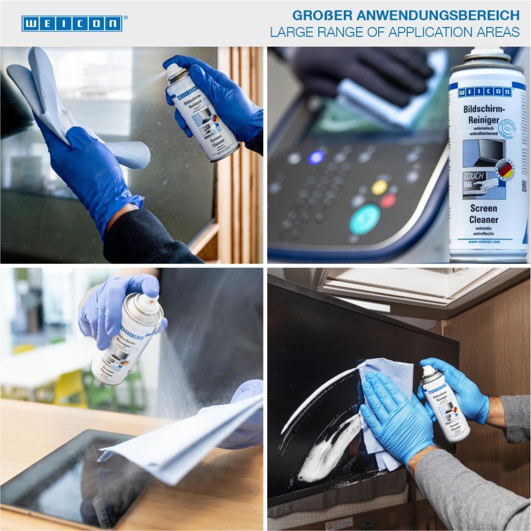 WEICON Bildschirmreiniger ist ein Spezialreiniger für die Reinigung und Pflege von empfindlichen Kunststoff- und Glasoberflächen und ist antistatisch und antireflektierend. Durch die antistatische Wirkung entsteht eine schmutz- und staubabweisende Oberfläche. WEICON Bildschirmreiniger entfernt Verunreinigungen durch Insekten, Schmutz, Staub, Fett und Nikotin schonend und streifenfrei. WEICON Bildschirmreiniger kann an allen Flach- und Plasmabildschirmen (wie bei Computern, Handys, Notebooks, Fernsehern, Scannern, Kopierern, etc.) und an Kunststoffgehäusen (an Computern, Scannern, Kopierern oder Fernsehgeräten) zum Einsatz kommen.