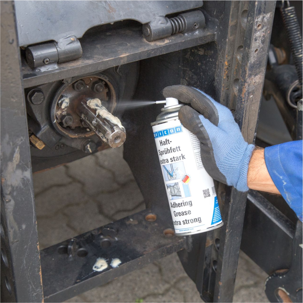 WEICON Haft-Sprühfett extra stark ist ein Spezialschmierstoff und Korrosionsschutz auch für Unterwasser-Anwendungen. Es ist ein wirksamer Schutz vor aggressiven Flüssigkeiten im maritimen Bereich und in Nassbetrieben. Haft-Sprühfett extra stark kann für Wälz- und Gleitlager auch im Mischreibungsbetrieb, Gelenke, Hebel, Gleitführungen, Spindeln, Keilwellen, offene Getriebe, Schneckengetriebe, Ketten und Drahtseile eingesetzt werden. Es ist für alle für die Fettschmierung zulässigen Gleitgeschwindigkeiten geeignet.