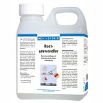 WEICON Rostumwandler dient zur Neutralisierung von Rost auf angerosteten Eisen- und Stahluntergründen und stoppt zuverlässig den Korrosionsprozess. Durch die spezielle Wirkstoffformel aus Säure und Tannin dringt der Rostumwandler in den Rost ein. Er wandelt in einem chemischen Prozess Eisenoxide in eine stabile Schicht um und hinterlässt zusätzlich durch Zinkphosphat einen temporären Korrosionsschutz. Je nach Kohlenstoffgehalt des Metalls verfärbt sich die behandelte Fläche bläulich-, bräunlich bis schwarz. Die Schicht bildet die ideale Basis für darauffolgende Schutzbeschichtungen, wie z. B. WEICON Zink-Spray. Mit WEICON Rostumwandler werden optimale Ergebnisse bei leicht verrosteten Oberflächen mit einem Rostgrad A und B erreicht. Loser Rost und lose Teile sollten vorher mechanisch entfernt werden. Der Umwandler wird erst aktiv, wenn er auf Rost oder Metall aufgetragen wird und kann großflächig an allen rostigen Stellen, beispielsweise an Maschinen und Anlagen, an landwirtschaftlichen Geräten sowie an Kraftfahrzeugen verwendet werden. Im Gegensatz zu anderen Umwandlern wird WEICON Rostumwandler nach Ablauf der Reaktionszeit mit klarem Wasser und einem Schwamm oder einer weichen Bürste von der behandelten Oberfläche entfernt. Dies dient der Beseitigung von Reststoffen, die sich durch den Umwandlungsprozess gebildet haben.