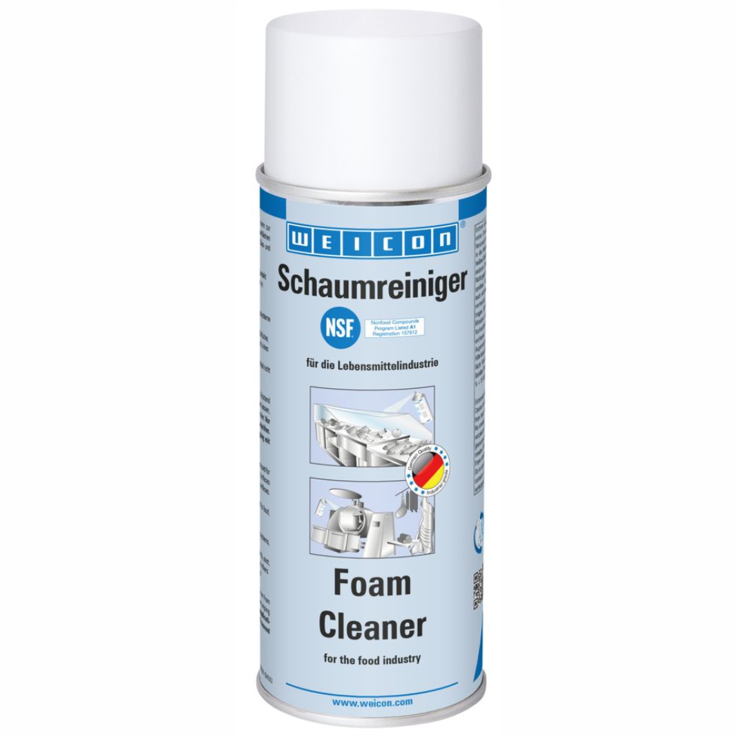 WEICON Schaumreiniger ist universell einsetzbar und kann zur Reinigung und Entfettung wasserbeständiger Oberflächen und zum Entfernen von Verunreinigungen auf Kunststoff,- Glas- und Textiloberflächen eingesetzt werden. Aufgrund der NSF A1-Registrierung eignet sich der Schaumreiniger zum Einsatz in sensiblen Bereichen, wie der Lebensmittel- und Getränkeindustrie sowie in der pharmazeutischen und kosmetischen Industrie. Das Spray eignet sich zur Reinigung von Transportbändern, die in Kontakt mit Lebensmitteln kommen, wie in der Produktion oder im Einzelhandel. Es entfernt Verschmutzungen an Maschinengehäusen und reinigt Waagen, Flat Screens, Touchscreens, Navigationssysteme und vieles mehr. Der Schaumreiniger beseitigt verschiedenste Verunreinigungen, wie Öle und Fette, Fingerabdrücke, Ruß, Nikotin, Staub sowie Rückstände von Insekten. Er kann überall dort verwendet werden, wo säurehaltige oder alkalische Reinigungsmittel nicht eingesetzt werden dürfen.