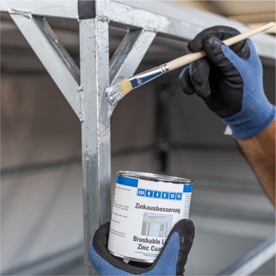 WEICON Zinkausbesserung ist ein aktiver Korrosionsschutz für alle metallischen Oberflächen, der im Farbton der Feuerverzinkung angeglichen ist. Bei WEICON Zinkausbesserung lagern sich plättchenförmige Metallpigmente (Flakes) parallel zur Oberfläche in mehreren, räumlich versetzten Schichten auf dem Untergrund ab (Schindeleffekt). Auch bei geringer Schichtstärke wird so eine hohe Korrosionsschutzwirkung erreicht. Damit werden die Anforderungen der DIN EN ISO 1461 erfüllt. Dadurch wird die Oberfläche länger vor eindringender Feuchtigkeit geschützt. In Verbindung mit der gleichzeitigen elektrochemischen Wirkung wird ein optimaler Korrosionsschutz erreicht.